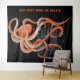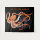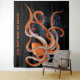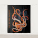 Um polvo laranja contra um pano de fundo de preto. Tentáculos de polvo dentro e em volta de bolhas e uma mandala azul