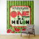 Doce e Moderno Design de Primeiro Aniversário! Fundo com Padrão de Casca de Melancia Verde com Doce polpa de melancia avermelhada/rosada ONE no canto cortado centralizado correspondente. Finalizado com fatias de melancia na parte inferior. Ótimo para o verão e tema de melancia no primeiro aniversário. Use como Fundo de Foto ou ponto focal de decoração de festa de aniversário. ©2022 Miss Sassy Party Designs