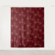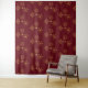 Uma tapeçaria com um padrão repetitivo de flocos de neve de ouro rico com formas cristalinas elegantes. Um fundo vermelho escuro.