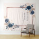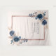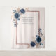Moderno e trendy, este tecido de fundo de casamento apresenta flores de rosa em aquarela em azul marinho e rosa empoeirado, com uma caixa de texto em folha de ouro rosa. Copyright Elegant Invites, todos os direitos reservados.