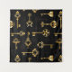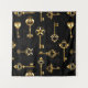 Padrão perfeito de chaves antigas, douradas e silhuetas em fundo preto.