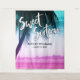 Impressione seus convidados com este painel de fundo de aniversário de 16 anos com tema de praia tropical moderna. Um design moderno com uma imagem de praia com palmeiras em azul e rosa.