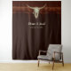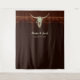 Pano de fundo para recepção de casamento country western cowboy com crânio de touro. Adereço de casamento personalizado em estilo rústico marrom vintage antigo fazenda. Decoração inspirada no velho oeste selvagem. Design moderno e sofisticado de animal de fazenda. Tipografia personalizada. Direitos autorais da imagem Marg Seregelyi Photography.