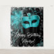 Pano de fundo de festa de aniversário de mascarada azul turquesa com bela máscara de mascarada azul turquesa em um belo fundo bokeh. Este belo banner de pano de fundo de festa de mascarada é facilmente personalizado com o texto de sua escolha. Você pode alterar a cor do fundo e do texto.