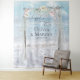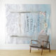 Coloque seus convidados na praia para uma sessão de fotos com este tapete de casamento (ou como um cenário coordenado para seus votos de casamento, livro de visitas ou mesa de casamento) - 'Felicemente Para Sempre' escrito em caligrafia moderna com os nomes dos noivos e a data do casamento em texto contemporâneo moderno. Elegante caramanchão à beira-mar feito de madeira flutuante e cortinas de tule decoradas com flores de magnólia pálidas e videiras, colocado em uma praia arenosa com ondas de água branca. Ao fundo, um belo céu azul com nuvens fofas. Arte original criada para a BarefootBride™ por © WhimsicalArtwork™ - Esta é parte de uma suíte completa de papelaria de casamento com papelaria de casamento, chá de bebê e outros eventos correspondentes.