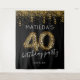 Diversão no pano de fundo do photobooth para festa de 40 anos com um fundo preto moderno, brilho dourado e confetes, 40 balões de hélio com estampa de leopardo, o nome da aniversariante e a data.