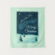 Ho-Ho-Ho Feliz tapeçaria de Natal com uma ilustração antiga de Papais noeis no seu trenó sendo puxados por suas renas. As estrelas pequenas espalham o céu noturno. A neve cobriu pinheiros no chão. Sensação retrô de safena.