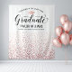 Elegante pano de fundo de festa de formatura para fotos apresenta um chapéu de graduado em cor de rose gold, "Graduado" em letra cursiva e texto personalizado moderno que pode ser personalizado com o nome do graduado e da escola. Um padrão de confete de falso papel alumínio em rose gold adorna o fundo - adereço de festa perfeito para os convidados se posicionarem em frente para tirar fotos com o formando! Vários tamanhos estão disponíveis.