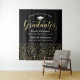 O legante cenário de festa de formatura preta dois formandos apresentam um boné de formando branco, "Formandos" em um roteiro fino de cor dourada e um texto personalizado moderno que pode ser personalizado com os nomes e escolas dos formandos. Um padrão de ouro caindo confete se veste em segundo plano - apoio perfeito para os convidados da festa ficarem em frente a fotos com o formando! Vários tamanhos estão disponíveis.