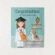 Parabéns a um estudante de veterinária pela sua formatura com a ajuda deste design personalizável com a ilustração original e fofa de Destei de uma mulher veterinária numa sala de exames de uma clínica veterinária. A veterinária está usando um boné de formatura preto com uma borla amarela, um jaleco branco, roupa de trabalho azul e tem um estetoscópio ao redor do pescoço. A veterinária tem cabelo castanho e uma expressão facial sorridente.