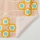 Hexagonal floral pattern with blue-green centers and orange outlines on a peach background. White lines connect the shapes, creating a geometric grid.