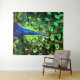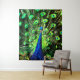 Uma tapeçaria magnífica mostra um retrato de um pavão, tentando suas coisas para o mundo ver. Toda a vibração da cor e autoorgulho UN-desculpe de um pavão masculino são os presentes da imaginação e graça de Deus, mas a execução do estilo expressionista de pintura original capturando esses presentes é apenas do coração, mente, computador e mãos do artista, Leslie Sigal Javorek.
