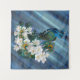 Dois Peacocks imperiais com colchetes finos terminando numa longa e extravagante cauda decorativa de penas impressionantes enroladas em torno de fragrantes flores brancas Frangipani num esmeraldo metálico verde-esmeralda texturizado padrão de pavão