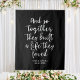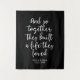 Fundo de casamento preto e branco com a citação "e assim juntos eles construíram uma vida que amaram". Decoração de cerimônia ou festa de recepção personalizada com os nomes do casal e a data do evento.