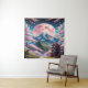 The scene is dramatically framed by billowing pink cherry blossoms (Sakura) and dominated by an enormous, glowing pink moon setting behind majestic, snow-capped mountains. The intricate detail, soft mist, and vibrant colors (pink, azure, emerald green) give the design a magical, cinematic, and otherworldly feel.