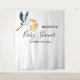 Uma cegonha voadora segurando um bebê. Um fundo elegante branco limpo para um pano de fundo de fotos de chá de fraldas. Modelo para a mãe ser o nome e a data. Letras negras. O texto: Chá de fraldas é escrito com um moderno e moderno roteiro de estilo escrito à mão. Sexo neutro, menino ou menina.