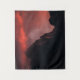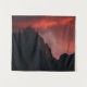 Fotografia paisagística de nuvens vermelhas queimadas do pôr do sol com os últimos raios solares a atingir as montanhas.