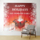 Traga o espírito do Natal para sua casa ou escritório com este lindo banner em vermelho, branco e dourado falso, apresentando uma linda caixa de presente vermelha que foi aberta e tem faíscas brancas flutuando para fora do topo. As fitas na caixa foram desamarradas e a tampa levantada para revelar uma pluma branca em cascata de faíscas. A caixa de presente repousa contra uma superfície branca brilhante acima da qual há um fundo vermelho com grandes modelos brancos para seu cumprimento de Natal e desejos de sua família ou empresa. Cada lado do cenário é preenchido com delicados flocos de neve brancos. Este design festivo é perfeito para a temporada de férias.