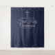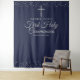 Pano de fundo para cabine de fotos da primeira comunhão com confetes delicados de purpurina prateada, você pode personalizar com suas informações especiais em texto prateado elegante em um fundo azul-marinho. Projetado por Thisisnotme©