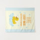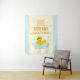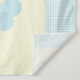 Um pato sortudo! Primeiro aniversário com pato de borracha e bolhas contra gingham azul claro e fundo amarelo pálido com texto laranja