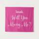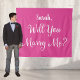 Sinal de proposta de casamento de namorada com um nome projetado em cores branco e rosa quente. Fundo com a pergunta "você casa comigo?" em branco.