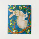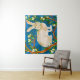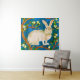 Tapeçaria na ilustração de um coelho selvagem, cercado por ramos floridos, contra fundo azul-denim escuro