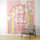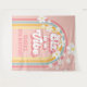 Seis é um Clima! Banner de 6º aniversário com inspiração retrô, fontes e cores estilo anos 70, arco-íris e margaridas em rosa