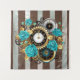 Relógio antigo e patenteado, adornado com joias, mãos de ouro e algarismos latinos com rosa de turquesa sobre fundo castanho e listrado. Estilo Steampunk.