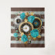 Relógio antigo e patenteado, adornado com joias, mãos de ouro e algarismos latinos com rosa de turquesa sobre fundo castanho e listrado. Estilo Steampunk.