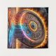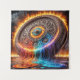 Um relógio circular massivo e intricadamente detalhado derrete sob chamas intensas, suas mãos e números se arrastando em riachos vibrantes de creme derretido, violeta neon e turquesa brilhante. Os rios surreais de cores moldadas piscinas na base, parecendo joias líquidas em uma paisagem feroz e esmagadora. A cena escura, atmosférica, traz uma reviravolta intensa e surreal ao conceito de tempo, perfeito para amantes de abstrato ousada, com um toque acirrado.