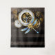 Marcações antigas com engrenagens de ouro e latão, decoradas com libélula mecânica sobre fundo castanho e listrado. Steampunk.