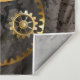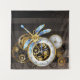 Marcações antigas com engrenagens de ouro e latão, decoradas com libélula mecânica sobre fundo castanho e listrado. Steampunk.