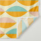 Repeating geometric pattern with overlapping leaf shapes in orange, teal, and pink on a beige background. The design conveys a retro, vibrant feel.