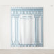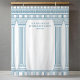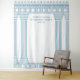 Greek or Roman Toga party backdrop featuring minimalist temple pillars and a blue Greek meander pattern. Customizable product for a memorable celebration. Perfect for your Ancient Greece or Ancient Rome-themed party.