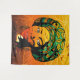Minha Design apresenta um retrato estilizado de uma linda mulher africana vestindo um manto colorido. A capa é enfeitada com padrões de folhas verdes e amarelas. Seu rosto está cheio de uma silhueta por sol, cheia de pássaros voando pelo céu e uma paisagem com árvores. Ela veste brincos grandes e ornamentados e um colar com a bainha. Estilo de Arte Pop original Ilustração vetorial Copyright BluedarkArt The ChameleonArt.