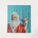 A cheerful Santa stands beside his loyal reindeer against a bright turquoise background, blending classic Christmas warmth with a modern pop-art twist. The vivid colors and joyful expressions make this festive image perfect for holiday decor, greeting cards, or seasonal gifts that celebrate whimsy and holiday spirit.