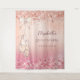 Uma tapeçaria para uma festa de Quinceañera feminina e glamorosa. Um fundo gradiente rosa dourado e rosa. Decorado com poeira brilhante falsa rosa dourada e rosa e sapatilhas de balé. Personalize e adicione um nome, idade, data. O nome é escrito em rosa dourado escuro com um estilo de letra manuscrita moderna.
