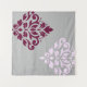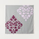 Scroll and leaf damask design in plum color and pink detail on a gray background.