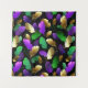 Seamless pattern of bright purple, green, and gold feathers on black Mardi Gras background. Design for the Mardi Gras holiday.