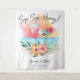 Tema tropical casal chuveiro, noivado ou festa de casamento fundo apresenta um pôr do sol na praia aquarela, coquetéis, flores de hibisco e folhas de palmeira com uma legenda "Sip Sip Hooray" em escrita à mão. Perfeito para celebrações de tema praia, verão, beira-mar, lua e tiki.