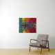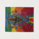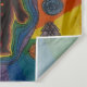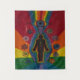 Este trabalho de arte é um desenho vibrante e colorido que apresenta uma figura central rodeada por várias formas geométricas e padrões. O fundo é dividido em seções de diferentes cores, criando um efeito arco-íris que irradia para fora do centro. As cores incluem vermelho, laranja, amarelo, verde e azul, dispostos em um padrão de gradiente. No centro da trabalho de arte, há uma silhueta preta de uma figura humana esboçada com múltiplas camadas de cores, parecidas com uma aura. Acima da figura, há um olho grande com uma íris de cor arco-íris e um aluno preto, que está fechado dentro de uma forma triangular. O olho parece estar emitindo feixes de cor arco-íris que se estendem para fora. Ao redor da figura central estão várias formas geométricas, incluindo círculos, triângulos e polígonos, cada uma cheia de padrões intrincados. Essas formas são dispostas simetricamente em torno da figura, adicionando à complexidade geral e ao interesse visual da peça. A trabalho de arte é interessante e relevante devido ao seu uso de cores vibrantes, padrões intrincados e elementos simbólicos, que podem transmitir temas de espiritualidade, energia e interconectividade. A combinação de formas geométricas com a figura humana central sugere um foco na relação entre o indivíduo e o universo.