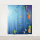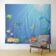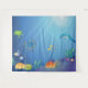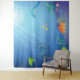 Criaturas marinhas sob o fundo de ilustração do mar para festa, evento ou teatro. A imagem colorida mostra uma cena submarina com tartaruga marinha, golfinho, polvo e vários peixes e corais, com filtragem de luz lá em cima.