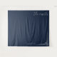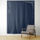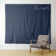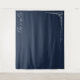 This elegant wedding backdrop features a deep navy blue background with a minimalist design. The left side showcases cursive script text, while the right includes geometric line art and clean sans-serif typography. The monochromatic color palette of white on navy creates a sophisticated contrast, perfect for formal events. Its contemporary style conveys a mood of calmness and modernity, making it ideal for weddings or upscale celebrations.