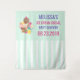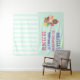 A tapeçaria cai atrás para um chá de fraldas ou outro evento. Ilustrada com uma tigela de sorvete com 3 scoops deliciosos cobertos de aspersores de doces. Um cone de sorvete também com 3 colheres de chocolate, baunilha e morango. Uma tigela de sobremesa cheia de sorvete com sabor neopolita com uma cereja deliciosa no topo. Um padrão de listras verdes e brancas no fundo.