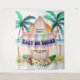 Adicione um pouco da atmosfera do surf e do mar ao seu chuvasco de bebê com esta tapeçaria tema praia! Com um paraíso tropical com sol, oceano, palmeiras e uma prancha de surfe adornada com uma faixa "Bebê a Bordo", luzes de corda, hibiscos e folhas de palmeira. As cores de verão são perfeitas tanto para um bebê menino ou menina, e isso pode ser usado tanto como uma decoração festiva quanto como um cenário de foto divertido. Arte por KL Stock