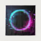 Synthwave Vaporwave Retrowave Glitch Circle with blue and pink glows with smoke and particles on laser grid space background.