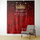 Crie seus próprios fundos elegantes vermelhos, pretos e dourados para tornar sua ocasião especial memorável e divertida! Nada diz "bem-vindo" mais do que uma grande faixa ou sinal para deixar seus convidados saberem que chegaram ao seu evento... Seja uma festa de aniversário de 16 anos, casamento, festa floral mexicana, chá de bebê ou noiva real, essas tapeçarias de fundo com modelo DIY podem adicionar aquele brilho e glamour que você está procurando. O tema de cores vintage neste tecido de modelo fácil é muito popular também para uma festa de máscaras... O design floral rústico ilustrado por Raphaela Wilson retrata um padrão de belas rosas vermelhas, uma coroa de tiaras douradas e confetes em forma de borboletas. Caso você escolha editar ainda mais o design real, você verá seleções alternativas em acabamentos de metal falso em rose gold e prata. Além disso, você pode clicar nos gráficos svg e mudá-los para qualquer cor que desejar - até mesmo as flores! Com tantas opções criativas ao seu alcance, esses fundos de foto personalizados em tecido podem combinar perfeitamente com o tema da sua festa. Você pode até mudar a caligrafia e o estilo de tipografia moderna para fontes que sejam do seu estilo. Aproveite! Categoria: fundos de casamento personalizados; fundos de parede suspensos personalizados para festas; e tapeçarias de fundo de casamento vermelhas, pretas e douradas. Cores do tema de casamento real: vermelho escuro, grená, burgundy, branco
