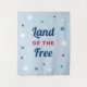 Tapeçaria de fundo de foto de festa patriótica elegante do Dia 4 de Julho apresenta um design de tipologia de texto de citação "Terra do Livre" em cores vermelho, branco, azul e azul-marinho com estrelas e cor de fundo azul claro.