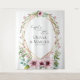 Tenha seus convidados sentados em frente a este deslumbrante cenário para o seu photobooth de casamento - (ou como um cenário coordenado para o seu livro de convidados ou mesa de casamento) - 'Felicidade Eterna' escrito em caligrafia moderna com os nomes dos noivos e a data do casamento em fonte contemporânea moderna. Moldura em estilo terrário com flores da primavera em tons de rosa e folhas de eucalipto em verde sálvia claro cercando a moldura. Design criado para a BarefootBride™ por © WhimsicalArtwork™ - Esta é parte de uma Suite de Papelaria de Casamento completa com convites de casamento, chá de bebê e outros eventos.