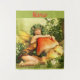 Fada loira de olhos azuis abraçando um grande cogumelo amanita para personalizar com sua própria saudação, nome, mensagem, etc